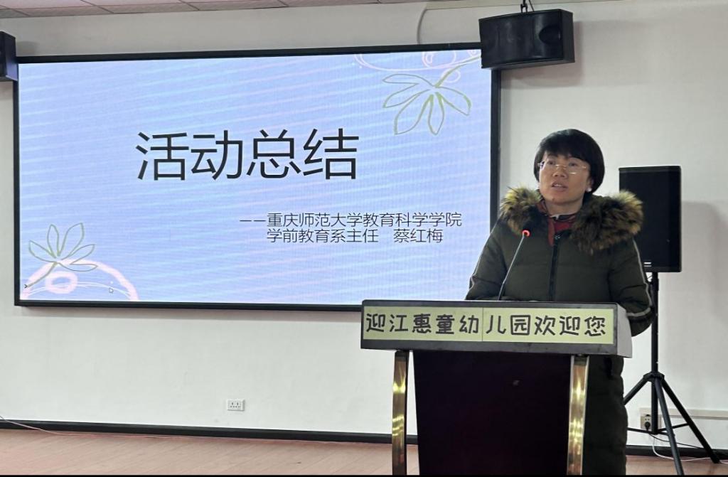 学前教育系主任蔡红梅副教授、吴晓云副教授率领学生团队,与重庆市渝中区蒙正幼儿园陆莹园长、光合森林幼教集团谢倩总经理所带领的团队,共同参与了迎江惠童幼儿园的实践教学研讨活动。